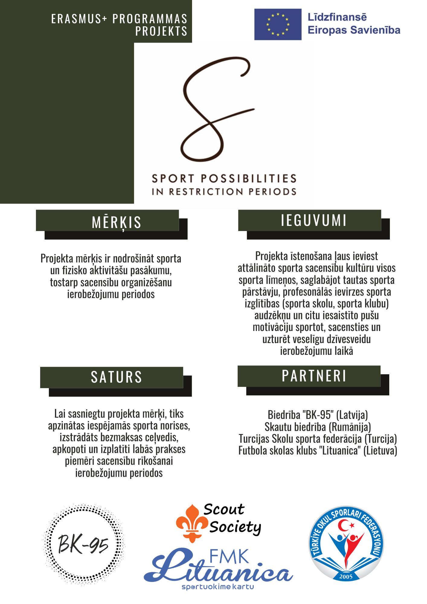 Projekts “Sport Possibilities in Restriction Periods” ir Eiropas Savienības finansēts. Paustie viedokļi un uzskati atspoguļo autora(-u) personīgos uzskatus un ne vienmēr sakrīt ar Eiropas Savienības vai Eiropas Izglītības un Kultūras izpildaģentūras (EACEA) viedokli. Ne Eiropas Savienība, ne EACEA nenes atbildību par paustajiem uzskatiem.